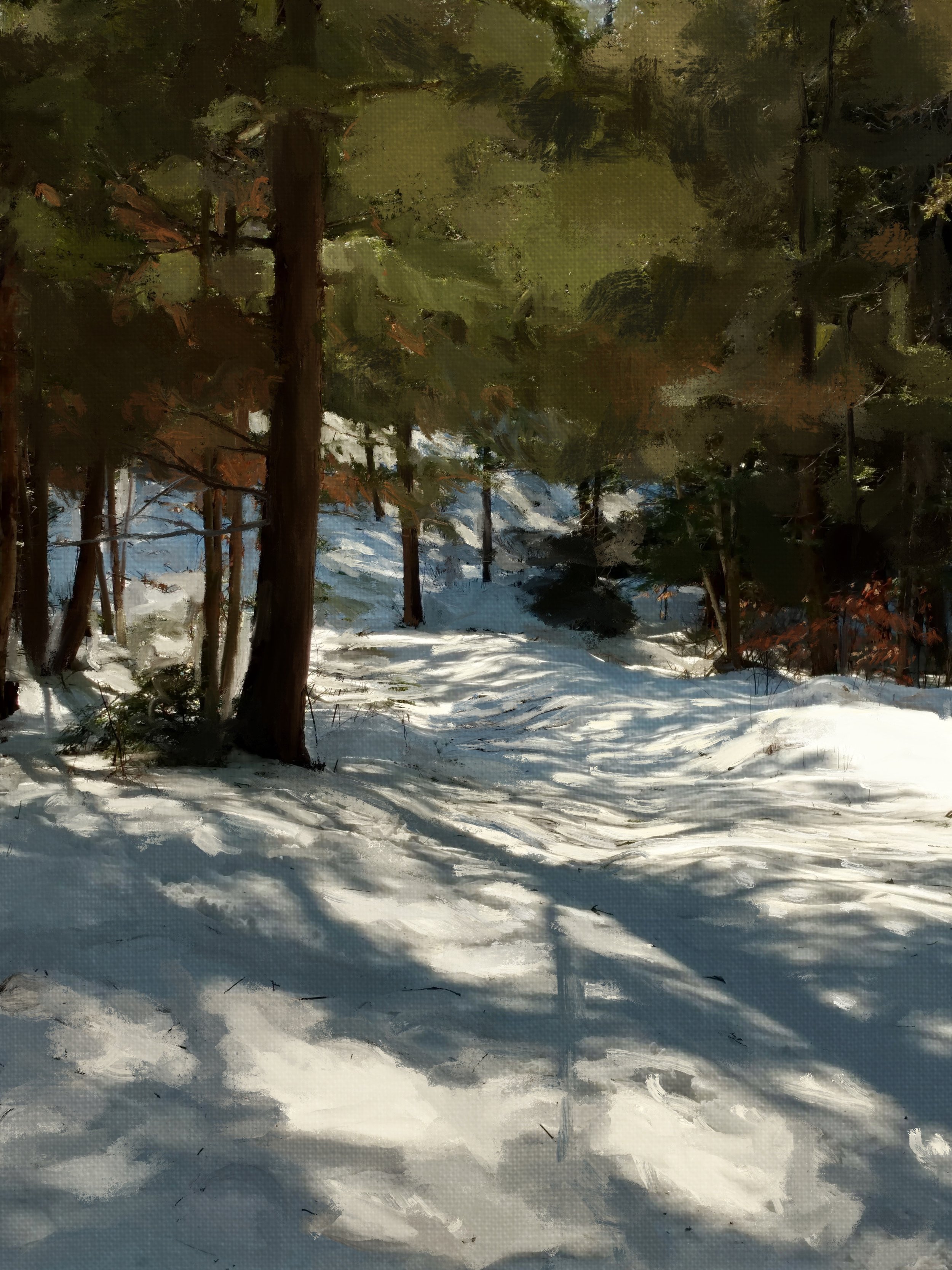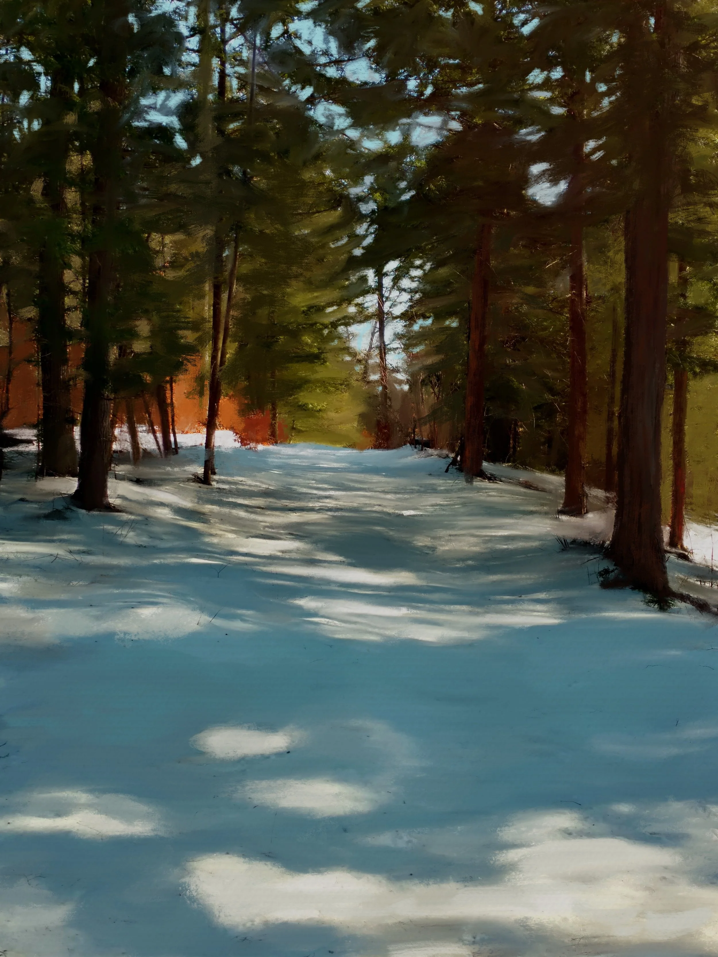I recently read about an artist painting in “quiet places” which totally resonates with me. The quiet places such as my paintings of my winter walks through my woods. I love capturing the cast shadows on the snow in my paintings.