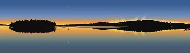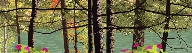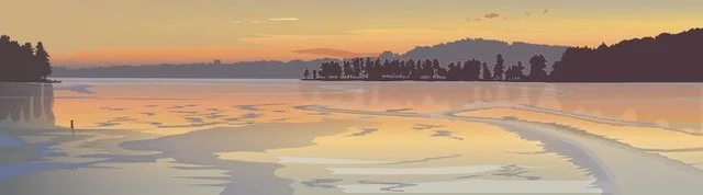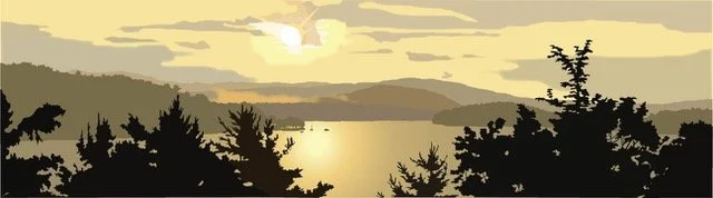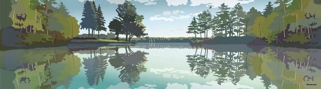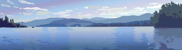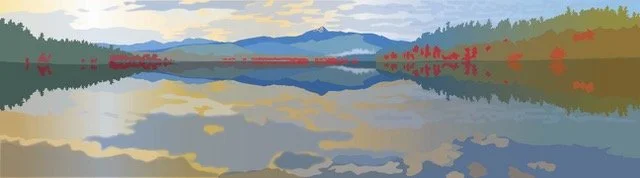 Hi there! I am a digital painter of NH landscapes—or lakescapes as I call them since the preponderance of my drawings are of lake scenes. I am continually struck by the beauty and variety of the lakes and mountains of the area. I attempt to convey the feeling of looking out across the water (or mountains, or forests, or sky). Or I delve into a close-up look at a flower or a patch of ground. Depth and space are created through the layering of colors of varying opacity. I have a graphic design background—I was in advertising design for 20 years before teaching digital art at Laconia High School for 20 years—so my drawings are informed by a graphic sensibility—bold, simple shapes and colors, concern for the impression of a piece.