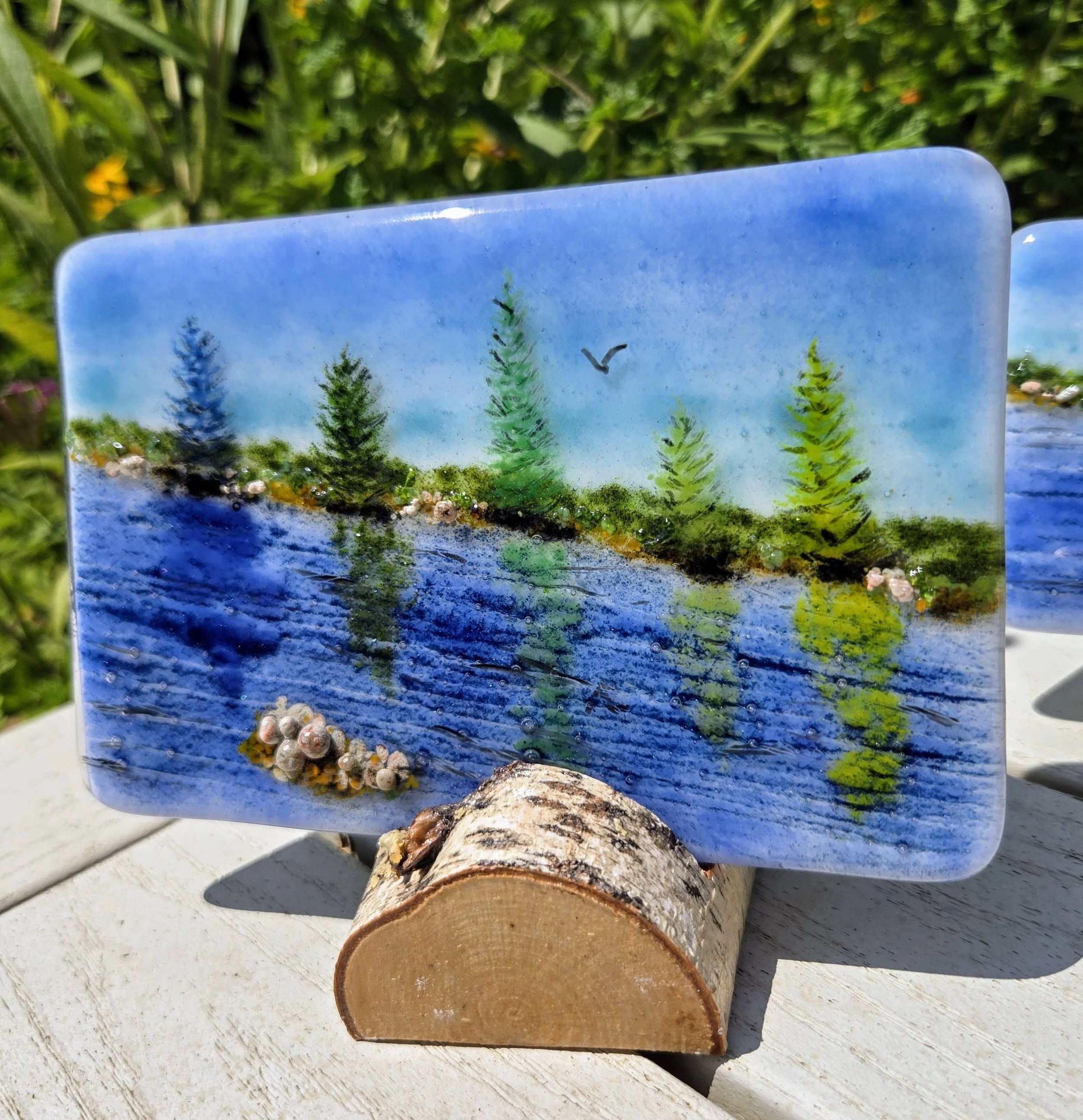 All of my glass is created/fused in my home studio, in Sanbornton, NH where I live amidst inspiring views of mountains, fields and Lake Winnisquam! I am but a guide, aiding in the transformation of bits of glass into the beauty that I see, from the white birches and purple lupines of spring mountains, to the intense blaze of fall color or the clear, glowing night sky.